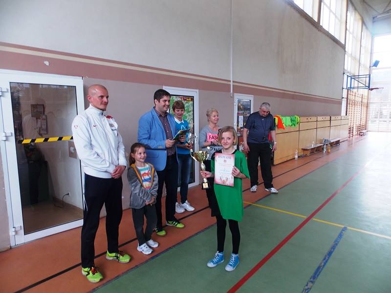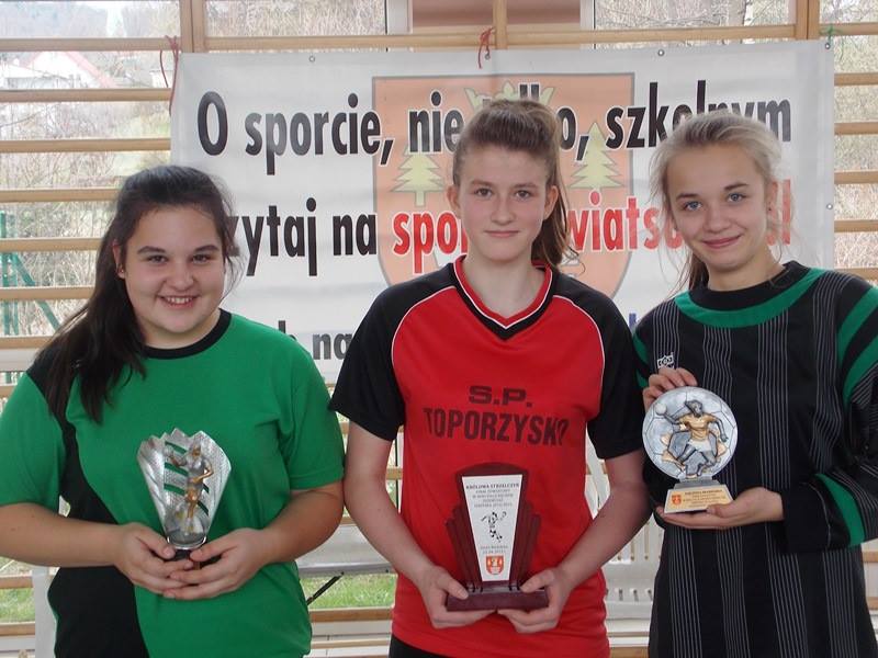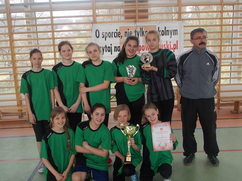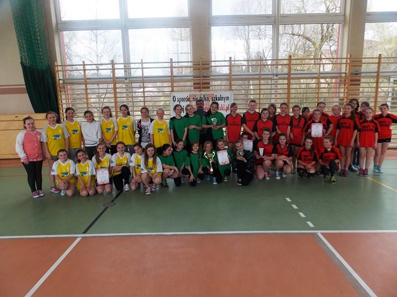 W rozgrywanym 13.04 2015 r. finale powiatowym po ambitnej grze (nasz zespół zrewanżował się zespołowi z SP Budzów za wyeliminowanie z rozgrywek w piłkę nożną halową) dość pewnie wygrał cały mecz 6:3 (bramki: Sobaniak A. – 3, Giza P. – 3). Drugi mecz z zespołem SP Toporzysko okazał się prawdziwym dreszczowcem, a zarazem przepustką do wygranej całego turnieju. Po dość słabym początku nasz zespół przegrywał już 1:4, jednak rzucone kolejne 4 bramki przez Angelikę Sobaniak wyprowadziły zespół na prowadzenie, niestety błąd w końcówce meczu spowodował, że całe spotkanie zakończyło się remisem 5:5 (bramki: Sobaniak A – 5, Giza P. – 1).