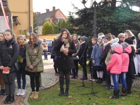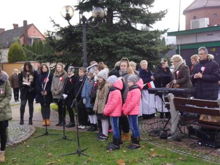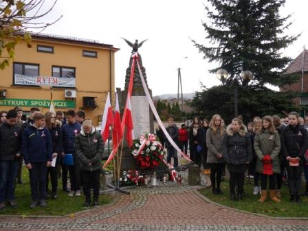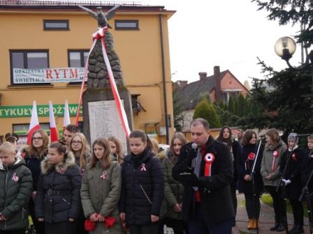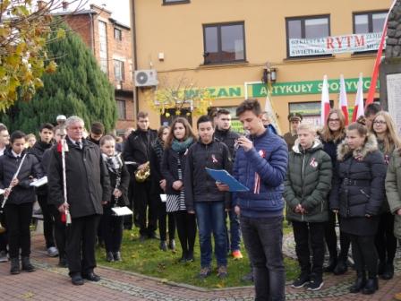 Po mszy świętej, na zembrzyckim rynku przed pomnikiem upamiętniającym tych, którzy oddali życie za Ojczyznę i wolność odbyły się główne uroczystości. Część oficjalną rozpoczęła Orkiestra Dęta „Rytm”, która zagrała hymn narodowy. Pan wójt Łukasz Palarski skierował do zebranych kilka słów, przypominając wagę tego święta. Młodzież szkolna przedstawiła montaż słowno-muzyczny, który wprowadzał w atmosferę wydarzeń poprzedzających datę 11 listopada 1918r. W skrócie zobrazowano sytuację polityczną kraju, jaka miała miejsce przed odzyskaniem niepodległości. Największy nacisk położono na ukazanie ducha narodu polskiego, który w czasie 123 lat niewoli, stale wychodził z inicjatywą walki za ojczyznę. Interpretacje muzyczne i recytatorskie utworów literackich pozwoliły zrozumieć rozterki i uczucia walczących o niepodległość. Odbył się także apel poległych, po którym delegacje, samorządowców na czele z panem wójtem Łukaszem Palarskim, Koła Gospodyń „Mioduszyna” oraz młodzieży szkolnej uczciły pamięć poległych składając wieńce i zapalając znicze przed pomnikiem. Na patriotyczną nutę brzmiały pieśni śpiewane przez chór szkolny, Koło Gospodyń „Mioduszyna” czy grane przez Orkiestrę Dętą „Rytm”: „Warszawianka”, „Rozkwitały pąki białych róż”, „Jedzie ułan”, wiązanki pieśni patriotycznych i inne.