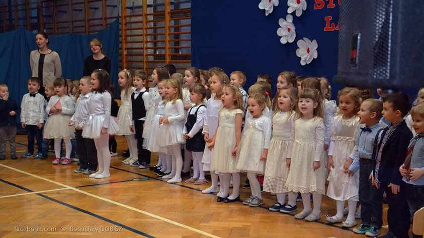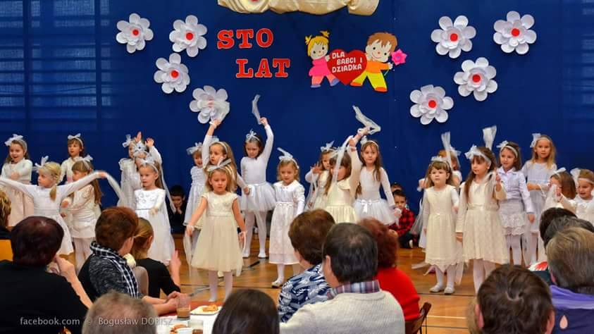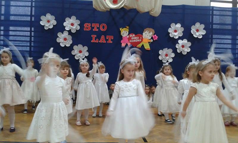 Uroczystą akademię rozpoczęto od powitania wszystkich zebranych oraz od niezwykłego i wzruszającego tańca Śnieżynek, zaprezentowanego przez dziewczynki.. Następnie Goście mogli podziwiać występy swoich wnucząt poczynając od grupy „Krasnoludki”. Tuż po najmłodszych przedszkolakach wystąpiły dzieci z grup: „Biedronek”, „Żabek” oraz „Słoneczek”. Wszyscy zaprezentowali swoje umiejętności wokalne, recytatorskie oraz taneczne, a dumni dziadkowie nagrodzili ich gromkimi brawami, ocierając łzy wzruszenia. Część artystyczna została zakończona przez dziewczynki pięknym układem tanecznym. Następnie wnuczęta złożyły życzenia, głośno odśpiewały „Sto lat” oraz wręczyły swoim Babciom i Dziadkom własnoręcznie zrobione laurki. Zaraz po osobistych życzeniach, całusach i uściskach Goście zostali zaproszeni na słodki poczęstunek przygotowany przez Rodziców.