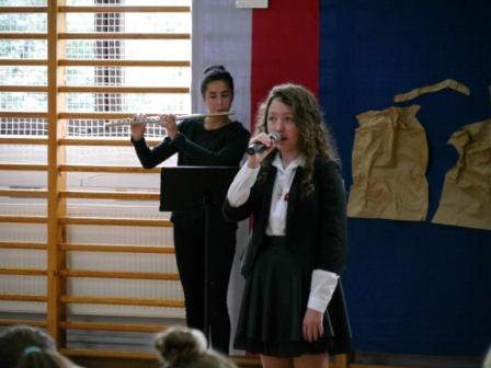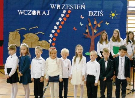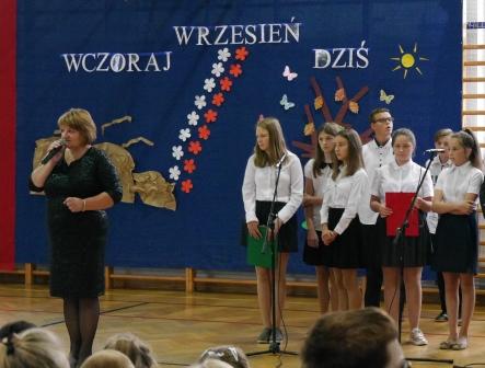 Uczniowie klasy VII wraz z wychowawczynią Barbarą Cyganik zadbali o to, aby przypomnieć o rocznicy wybuchu II wojny światowej - 1 września 1939 roku, aby uczcić pamięć tych, którzy bohatersko walczyli o wolność naszego kraju i złożyć im hołd pamięcią, słowem i piosenką. O oprawę muzyczną zadbał pan Edward Stopa wraz z zespołem wokalnym.