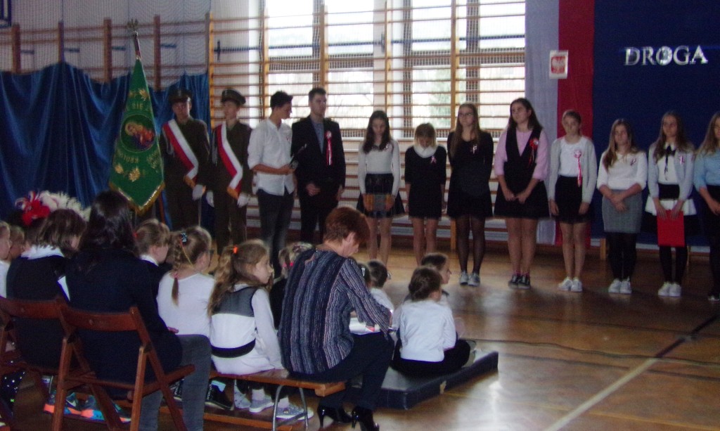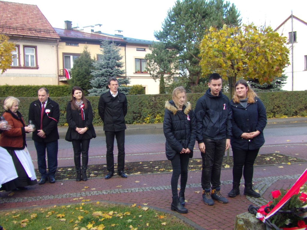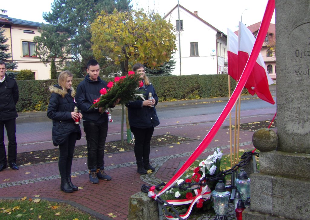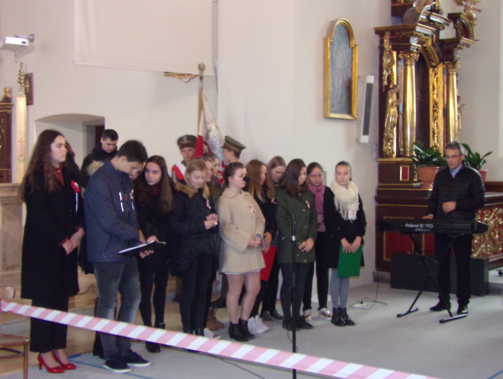 Dnia 11.11.2017 r. msza święta w kościele parafialnym w Zembrzycach, patriotyczne kazanie ks. Jana Kapusty, przypinanie kotylionów, rozdawanie chorągiewek przez młodzież rozpoczęły uroczyste obchody 99 rocznicy odzyskania przez Polskę niepodległości, a później odbyła się akademia, która miała przede wszystkim przypomnieć walkę i determinację Polaków, ale także wzbudzić w nas refleksje. Część artystyczna wprowadziła zgromadzonych w atmosferę wydarzeń poprzedzających datę 11.11.1918 r. Zobrazowano sytuacje polityczną kraju, ukazano ducha walki narodu polskiego. Utwory poetyckie podkreślały nastrój lat walki, ich uzupełnieniem były utwory muzyczne, począwszy od pieśni patriotycznych „Rozkwitały pąki”, „Wojenko, wojenko”, „Marsz I Brygady”, wykonane przez chór szkolny oraz wiele innych pieśni patriotycznych zagranych przez Orkiestrę Dętą „Rytm” pod batutą p. Kazimierza Gromady i odśpiewanych przez Koło Gospodyń pod przewodnictwem p. Barbary Cyganik. Centralnym punktem uroczystości był apel pamięci wspaniale odczytany przez ucznia klasy III gimnazjum Dawida Smolika, następnie delegacje w osobach zaproszonych gości p. wójta Gminy Zembrzyce Łukasza Palarskiego, p. sekretarz Danuty Smyrak, przedstawicieli powiatu p. Joanny Stypuły, p. Piotra Talagi, pań z Koła Gospodyń oraz uczniów Zespołu Szkół w Zembrzycach złożyły hołd poległym w postaci wiązanek i zapalenia zniczy przed pomnikiem na rynku zembrzyckim (aura spłatała nam psikusa i w ekspresowym tempie musieliśmy przenosić obchody do kościoła, a sprzęt nakryć folią, aby nie uległ zniszczeniu).