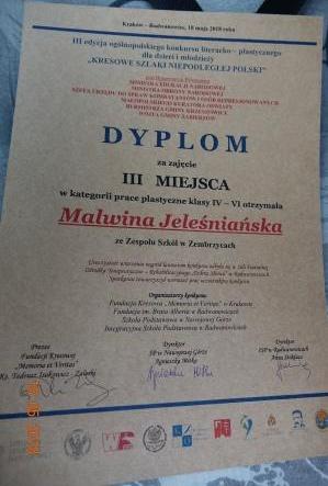 Zespół Szkół w Zembrzycach reprezentowała uczennica klasy 5 – Malwina Jeleśniańska, która zajęła III miejsce w konkursie plastycznym. Nagrodę i dyplom otrzymała z rąk Barbary Nowak – małopolskiej kurator oświaty oraz posła Józefa Brynkusa.(mj)