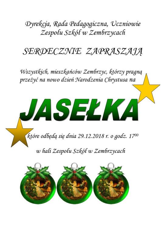 Dyrekcja, nauczyciele oraz uczniowie zapraszają na JASEŁKA, które odbedą się 29.12.2018r. o godz.17 00 na hali sportowej Zespołu Szkół w Zembrzycach.