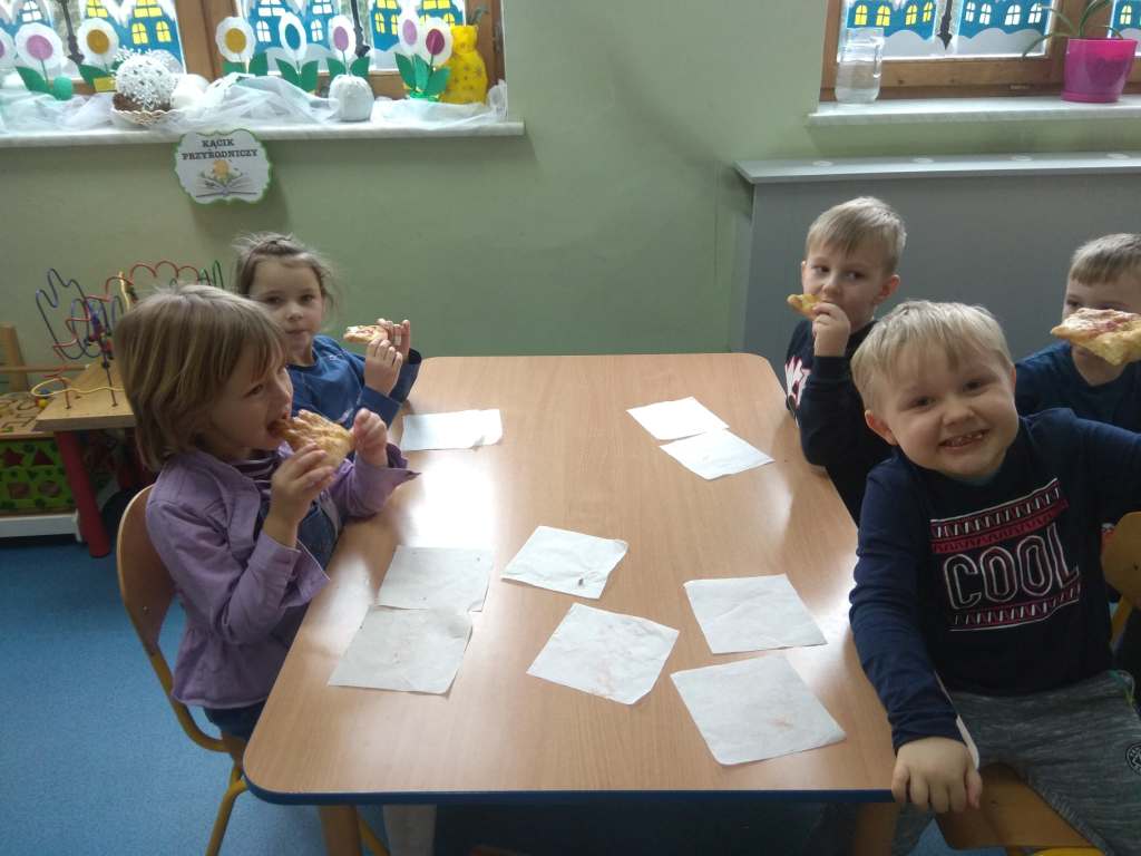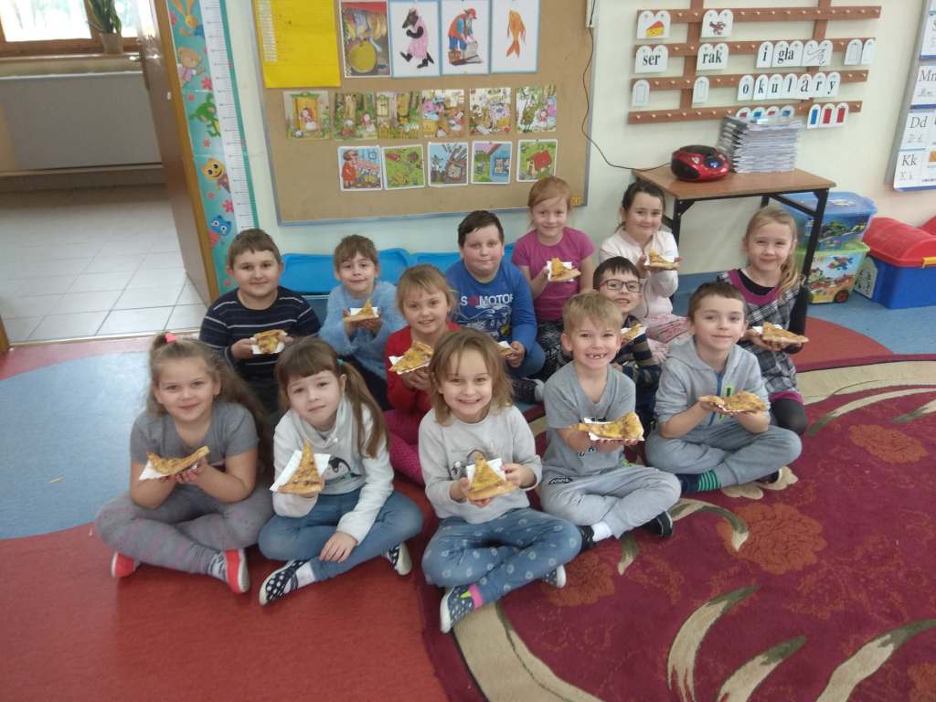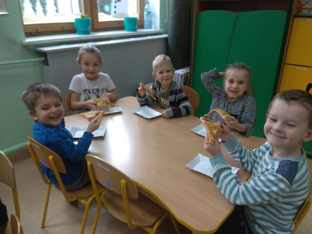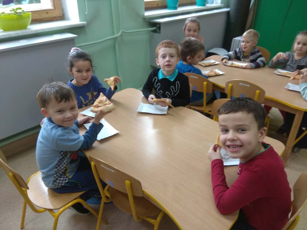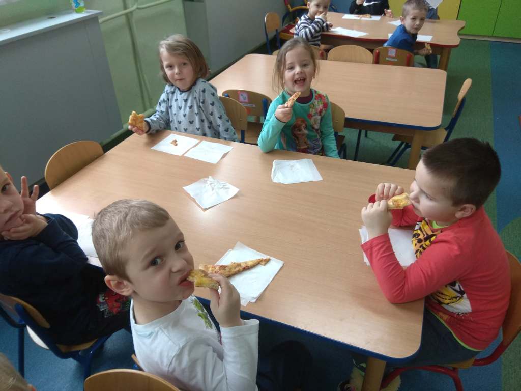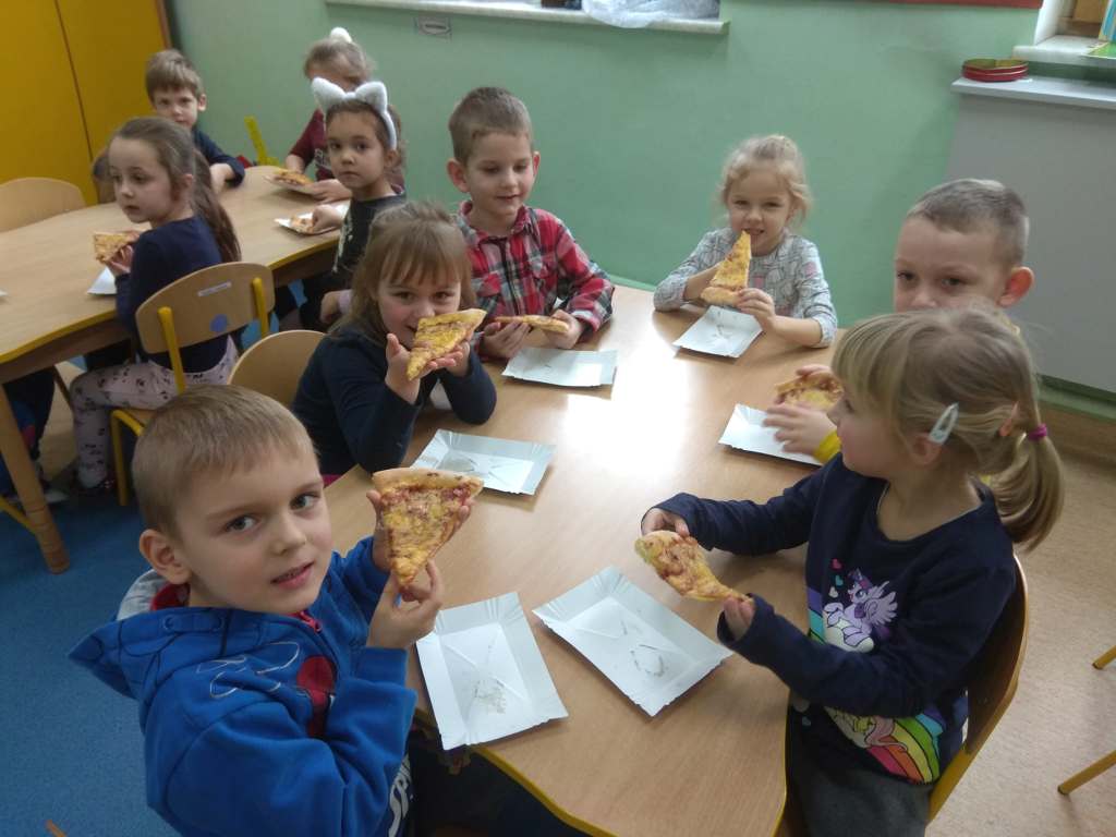 9. lutego na całym świecie obchodzony jest Międzynarodowy Dzień Pizzy. Tego dnia przedszkolaki poznały historię pizzy, wykonały ciekawe prace plastyczne, bawiły się w zabawy ruchowe dotyczące pizzy, a także dzieliły się własnymi doświadczeniami. Jednak najwięcej radości i emocji dostarczyło dzieciom skosztowanie pysznej pizzy. Cały dzień upłynął w miłej i radosnej atmosferze.