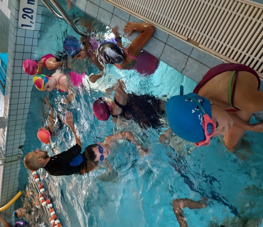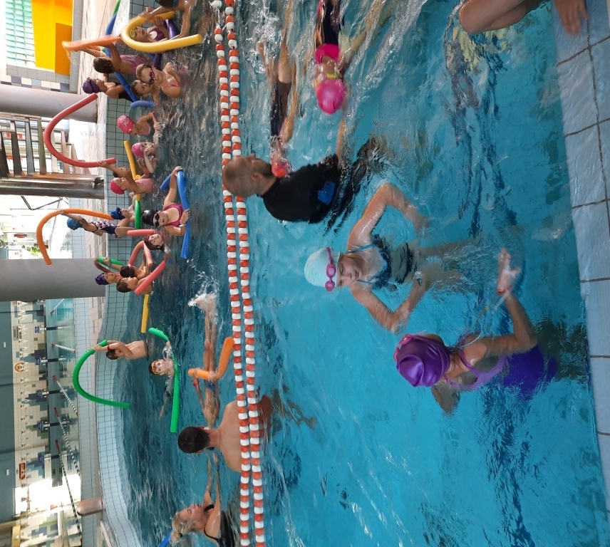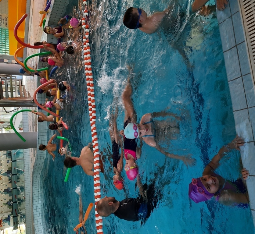 Uczniowie klas młodszych biorą udział w projekcie „Uczę się pływać”. Regularnie prowadzone zajęcia na basenie, dają szansę opanować tę cenną umiejętność pod okiem wykwalifikowanych i doświadczonych instruktorów. Nasi uczniowie ćwiczą w grupach utworzonych z uwzględnieniem ich wyjściowych umiejętności i możliwości indywidualnych. Wspólnie spędzony czas na basenie daje również możliwość integracji międzyklasowej, wspólnej nauki i zabawy.