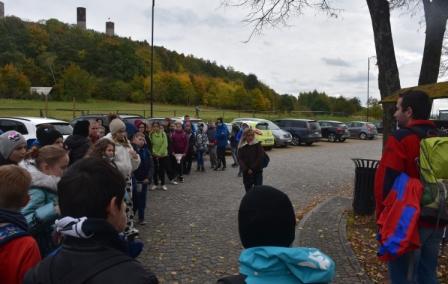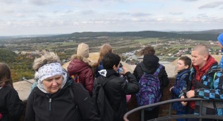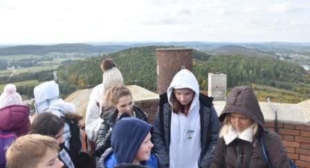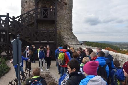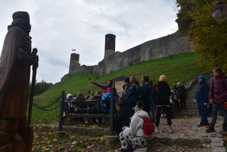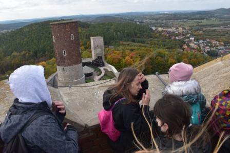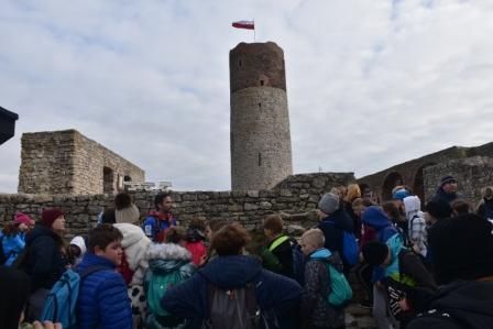 2. Zamek w Chęcinach, usytuowany na wzgórzu (367 m.n.p.m.), który pochodzi z 1306 roku. Na przestrzeni lat budowla ta była ośrodkiem administracji książęcej i gościła kilkukrotnie zjazdy za rycerstwa. Z wieży zamku uczniowie mieli możliwość podziwiać krajobrazy wzgórza Miedzianka, jak wskazuje nazwa, znajdują się tu złoża miedzi intensywnie eksploatowane już w średniowieczu. Powstały wówczas sztolnie i szyby górnicze, których pozostałości zachowały się do naszych czasów. Nieco dalej w kierunku północnym rozciągało się łagodne Pasmo Bolechowickie z kulminacją Czerwonej Góry, znanej z czerwonego zlepieńca zwanego zygmuntowskim, z którego została wzniesiona w 1644 roku warszawska kolumna króla Zygmunta III Wazy, ufundowana przez jego syna Władysława.