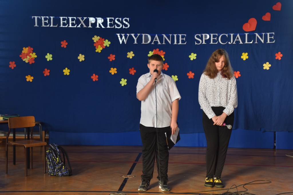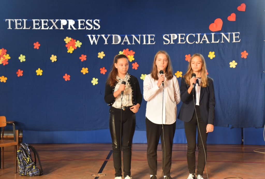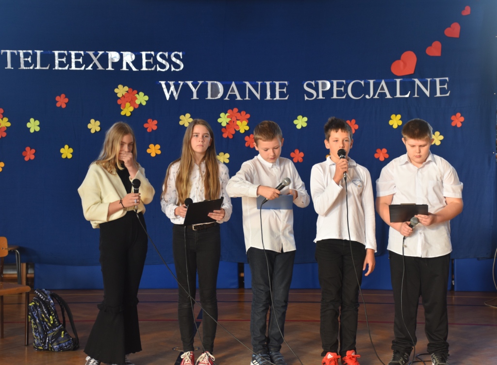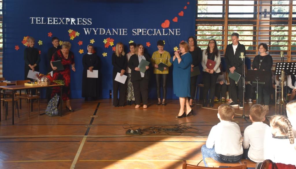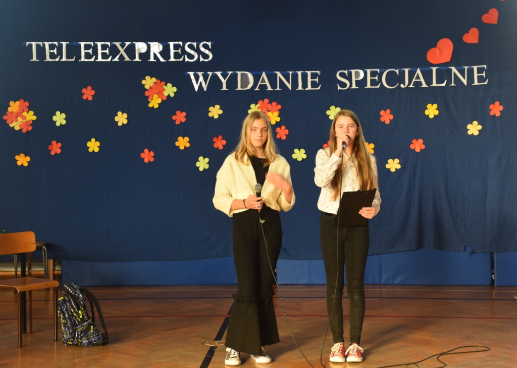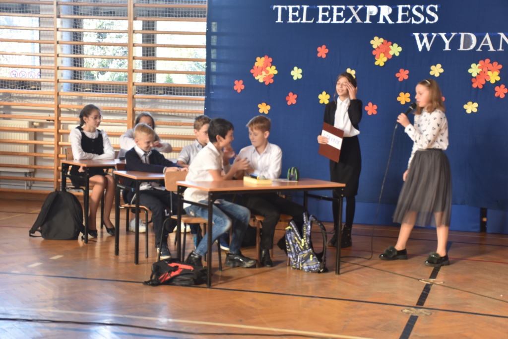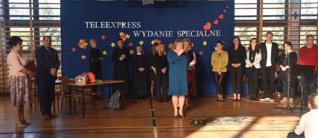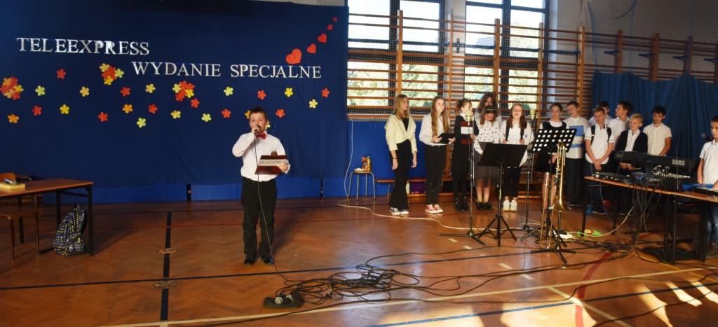 Po przejściu do szkoły wszyscy pracownicy i uczniowie spotkali się na hali sportowej, aby obejrzeć „Specjalne wydanie Teleekspressu” – w takiej bowiem konwencji przygotowany został apel przez uczniów klasy V i VI wraz z wychowawcami. W trakcie występu nie brakło akcentów żartobliwych, np. scenki lekcyjnej czy wizyty przybysza z kosmosu, nie brakło też życzeń, podziękowań i kilku chwil z piosenką.