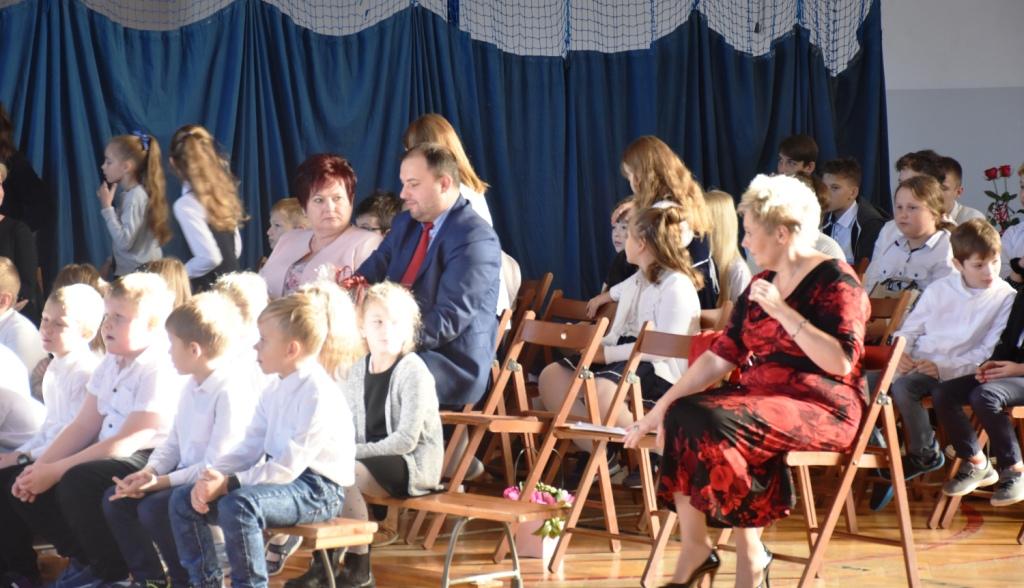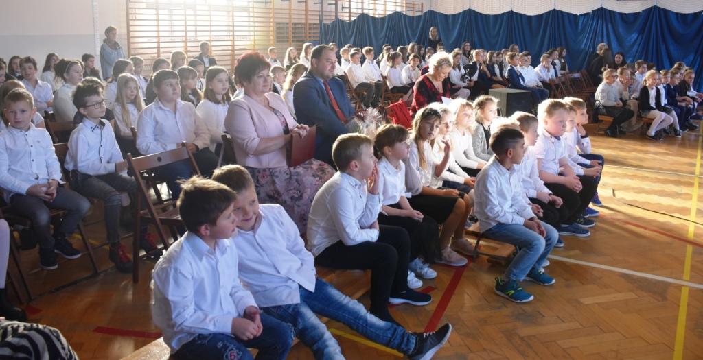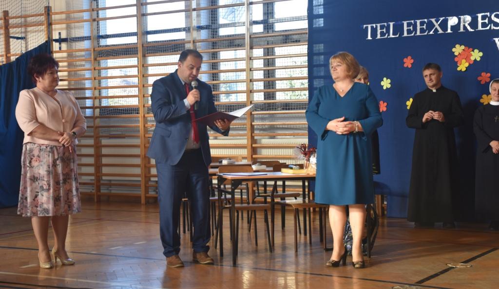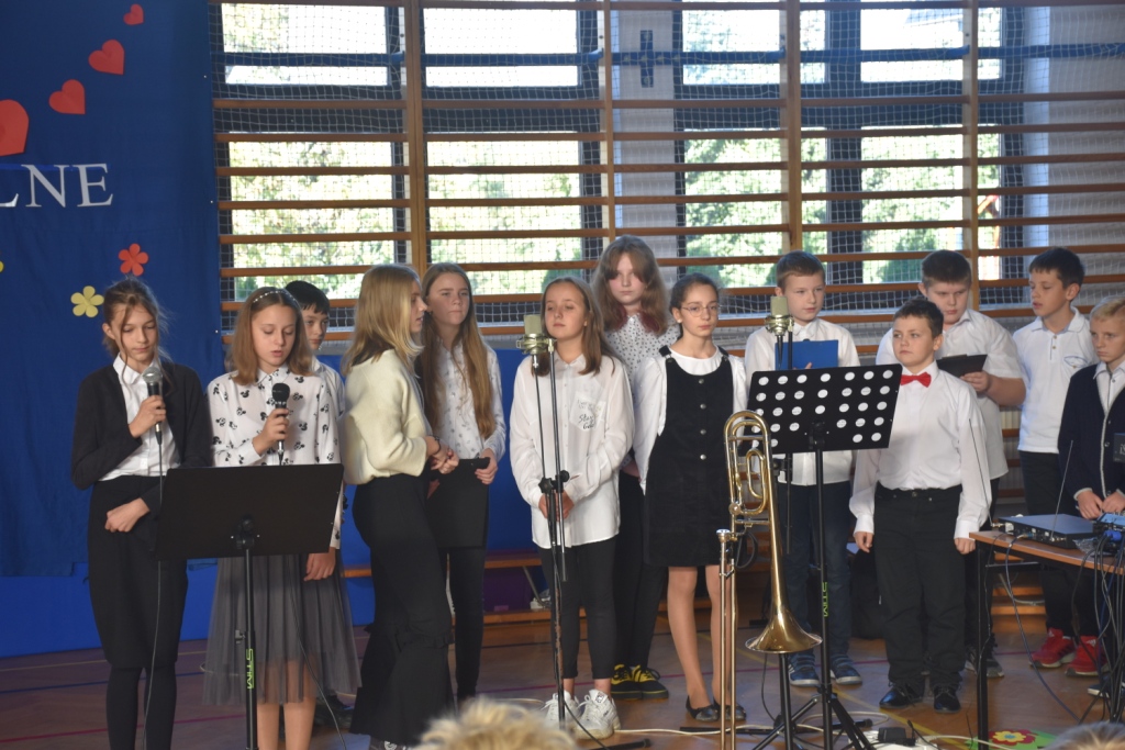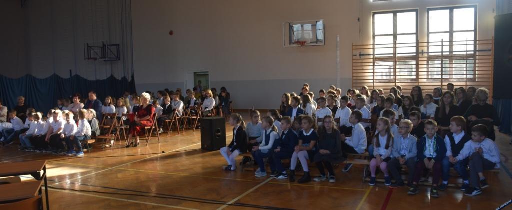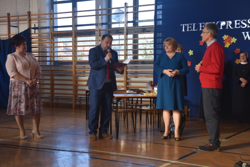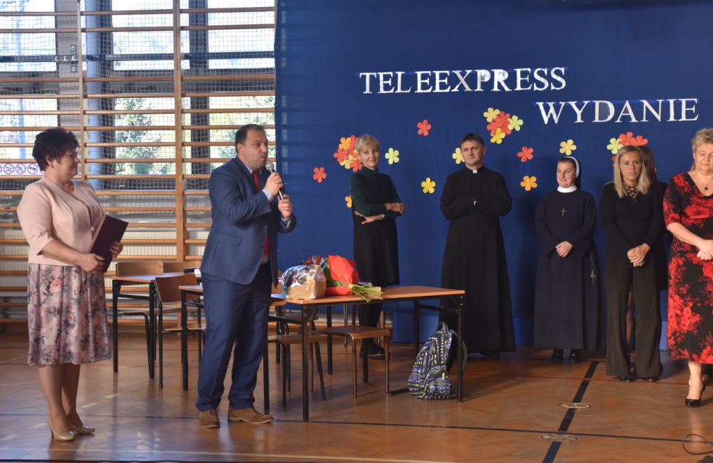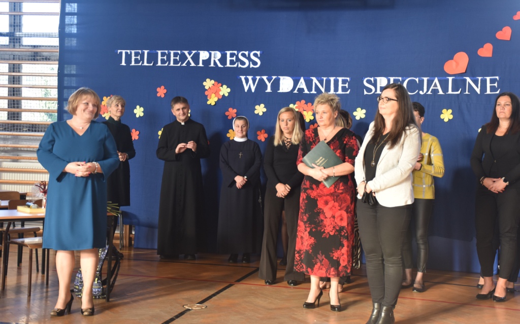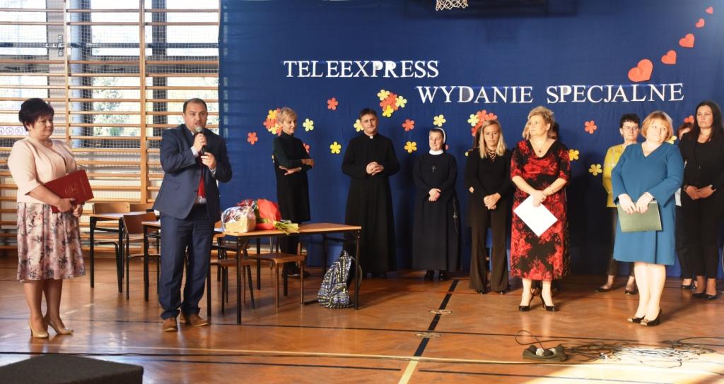 Po przejściu do szkoły wszyscy pracownicy i uczniowie spotkali się na hali sportowej, aby obejrzeć „Specjalne wydanie Teleekspressu” – w takiej bowiem konwencji przygotowany został apel przez uczniów klasy V i VI wraz z wychowawcami. W trakcie występu nie brakło akcentów żartobliwych, np. scenki lekcyjnej czy wizyty przybysza z kosmosu, nie brakło też życzeń, podziękowań i kilku chwil z piosenką.