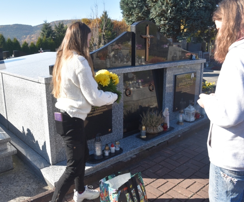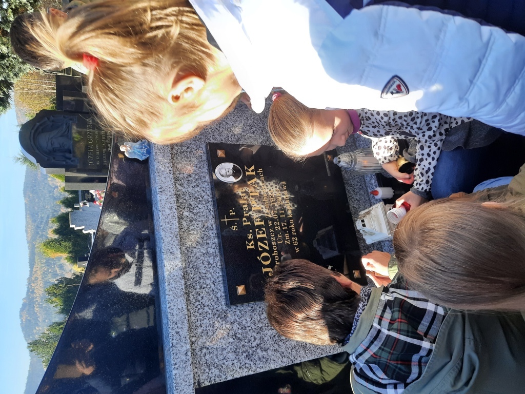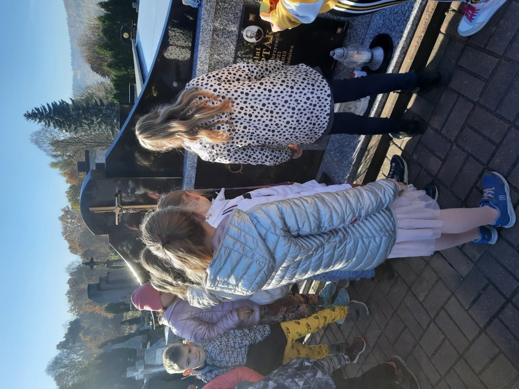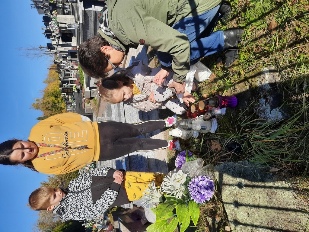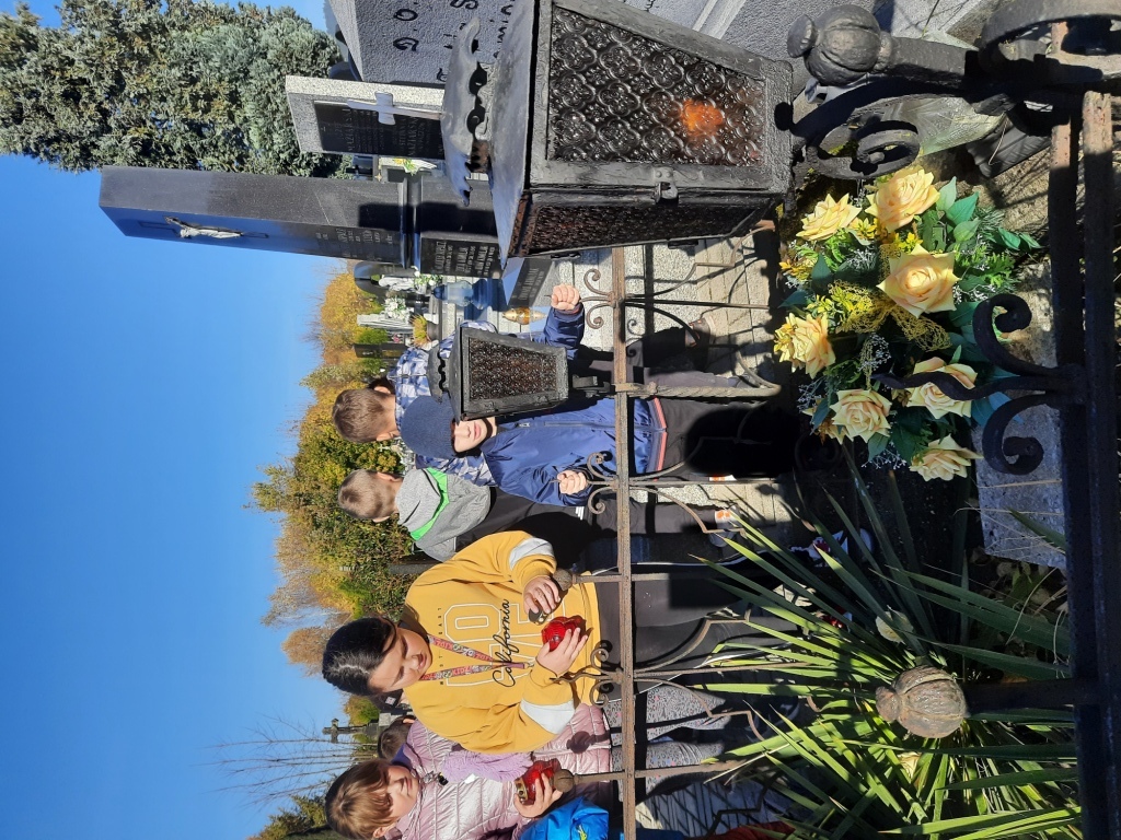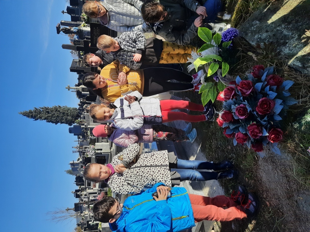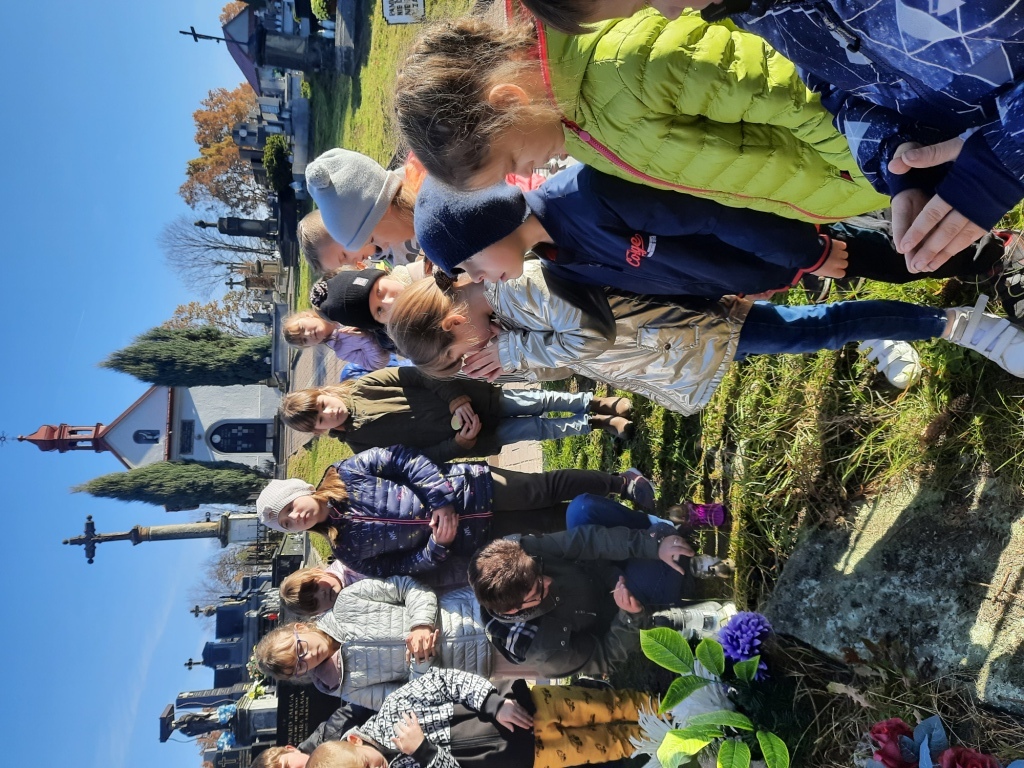 i nauczycielami na cmentarz parafialny. Uczniowie mieli możliwość poznać wiele ciekawych historycznie grobowców oraz odwiedzić groby zasłużonych osób naszej miejscowości, gdzie złożyli wiązanki oraz zapalili znicze oddając cześć ich pamięci.