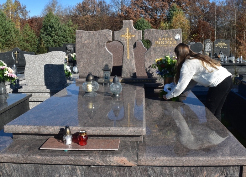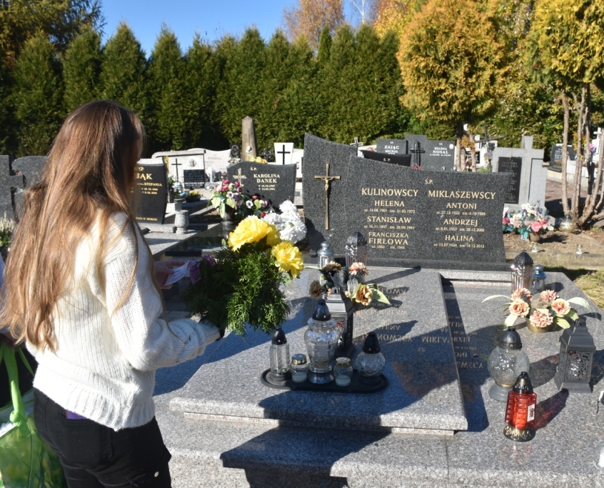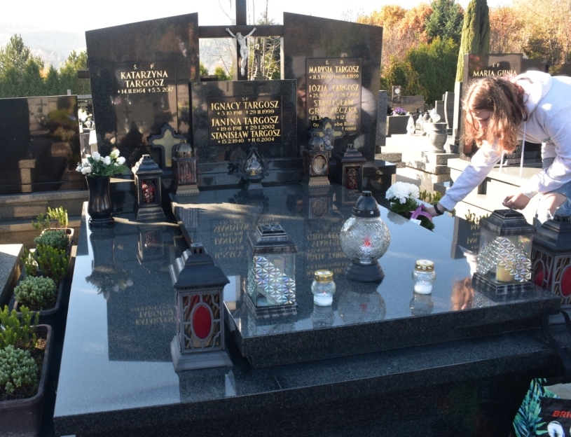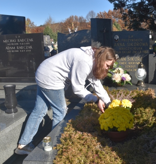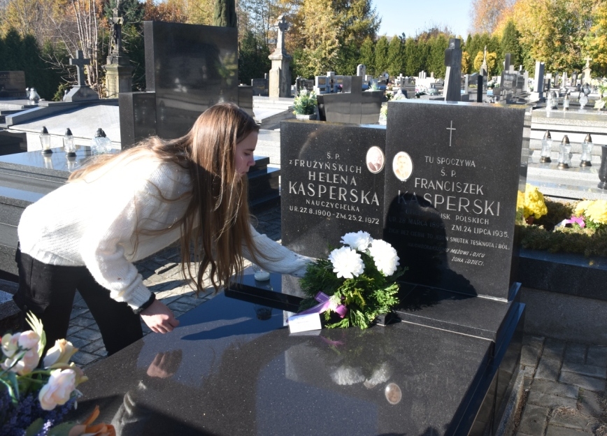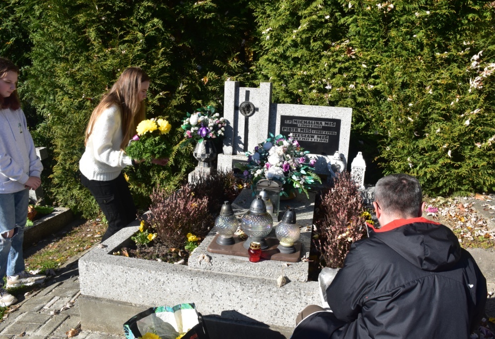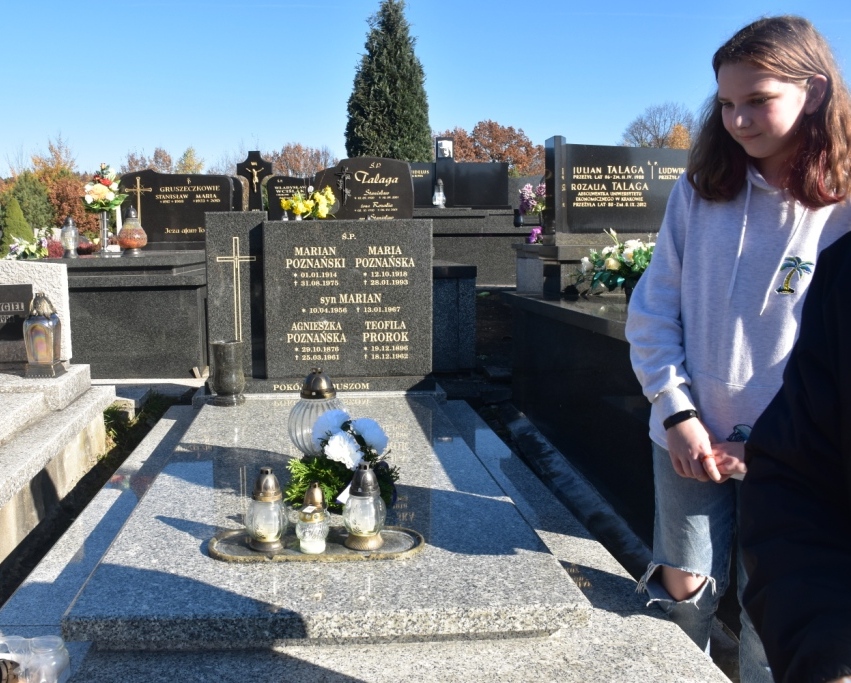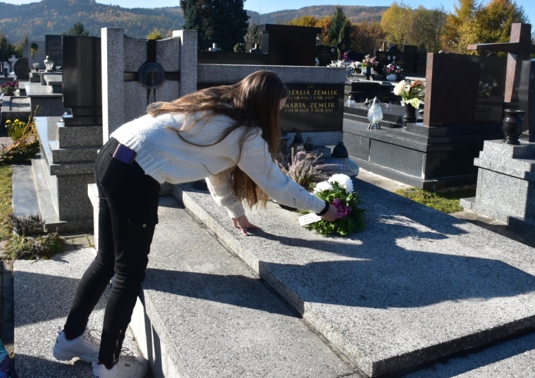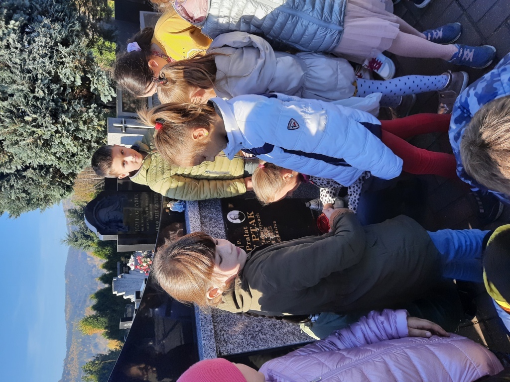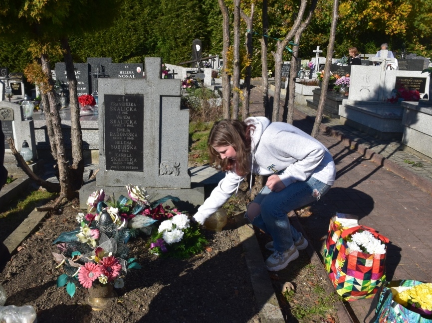 i nauczycielami na cmentarz parafialny. Uczniowie mieli możliwość poznać wiele ciekawych historycznie grobowców oraz odwiedzić groby zasłużonych osób naszej miejscowości, gdzie złożyli wiązanki oraz zapalili znicze oddając cześć ich pamięci.