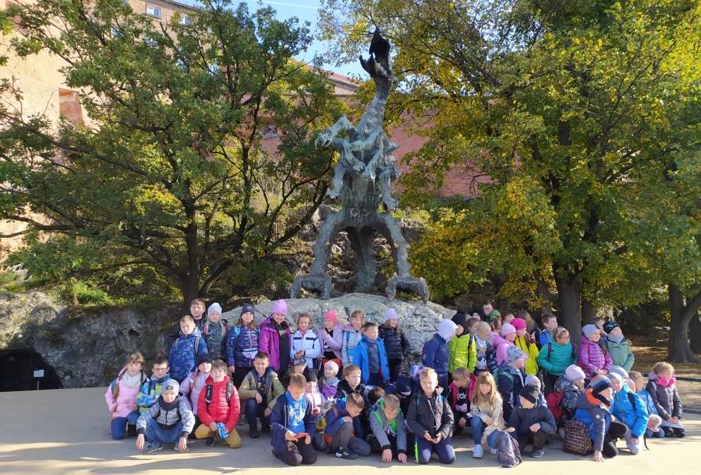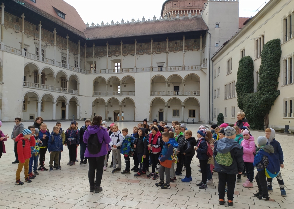 i artystycznych. To niezwykłe sanktuarium określa tożsamość Polaków, jest ich symbolem narodowym i kulturowym. Wawel był siedzibą polskich władców, miejscem gdzie kształtowała się historia Polski. Uczniowie zwiedzili dziedziniec arkadowy Zamku Królewskiego, Katedrę Wawelską – miejsce koronacji królów Polski. Mieli okazję posłuchać historii związanej z tym obiektem. Kraków ma do zaoferowania mnóstwo podań, a najwięcej z nich związanych jest z Wawelem i okolicznymi kościołami. Uczniowie słuchali opowieści o królu Kraku ,o Smoku Wawelskim zjadającym mieszkańców miasta. Pani przewodnik starała się zainteresować uczniów, zadając im pytania, organizując mini konkursy, które w interesujący sposób przybliżały naszą ojczyznę, jej naturę