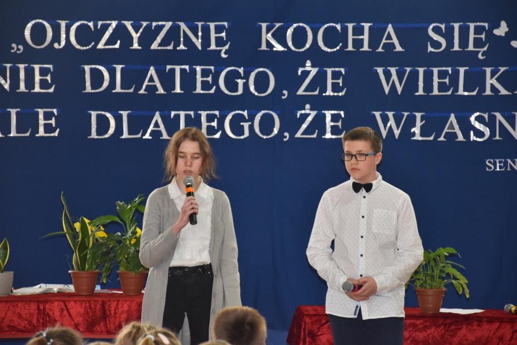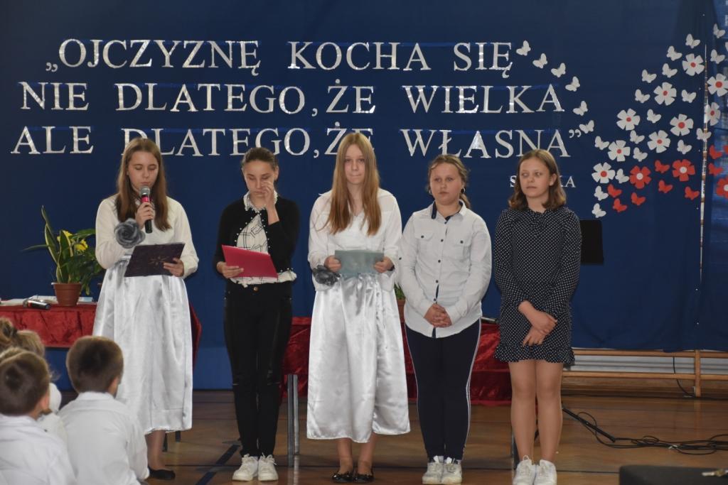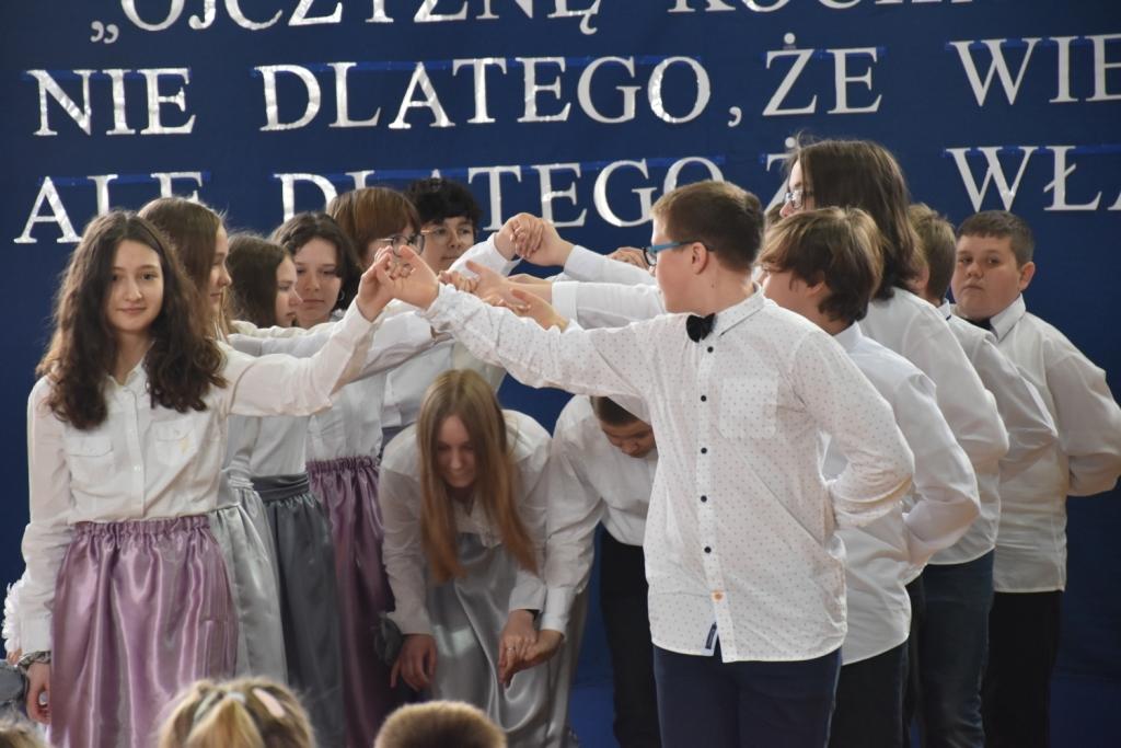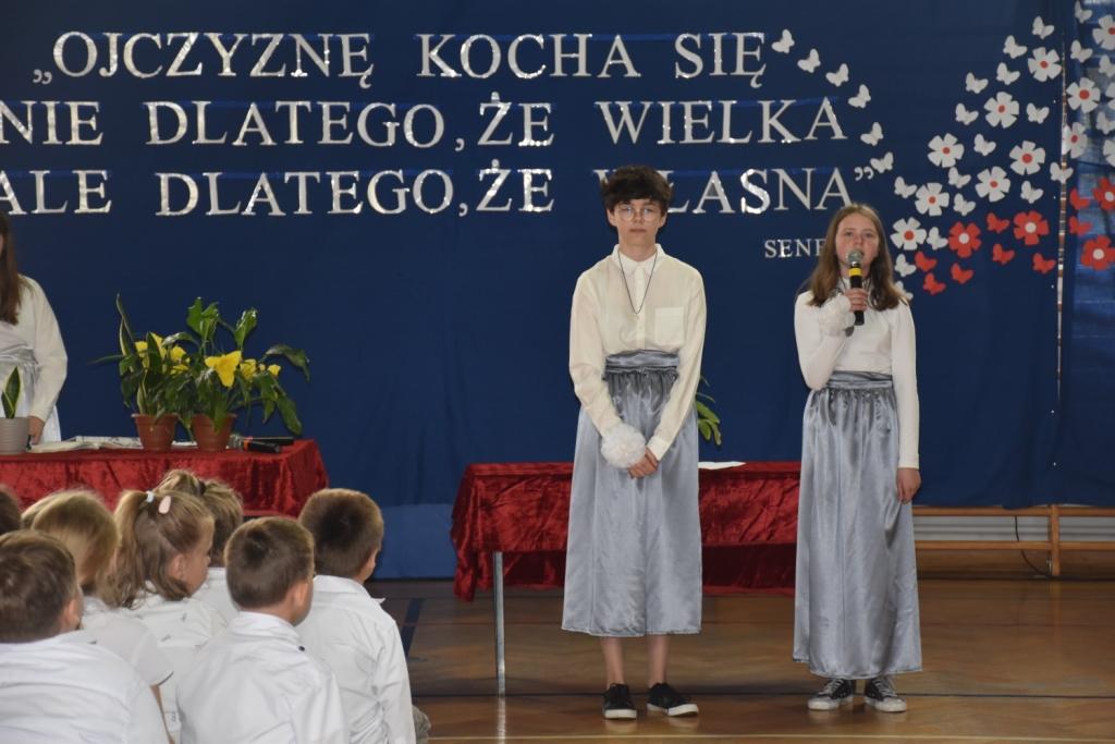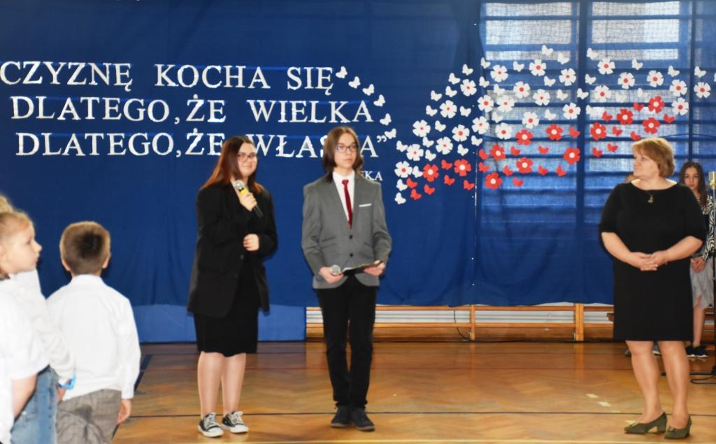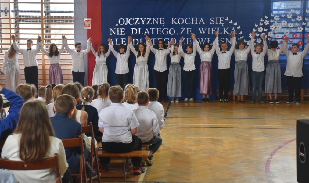 25 IV 2022r. to dzień, w którym świętowaliśmy kolejną rocznicę Uchwalenia Konstytucji 3 Maja. Akademię rozpoczął dostojny taniec dworski, czyli polonez. Wykonanie tego pięknego układu przez uczniów klas VII, przygotowanego pod kierunkiem Pani Dyrektor mgr Elżbiety Fidelus, podkreśliło uroczysty charakter wydarzenia.