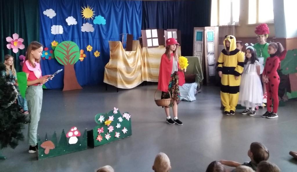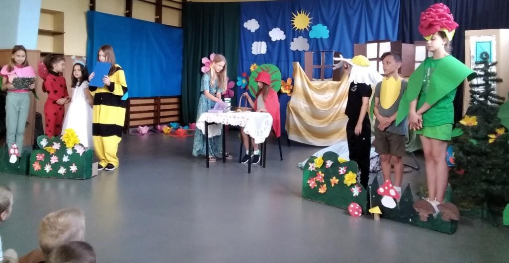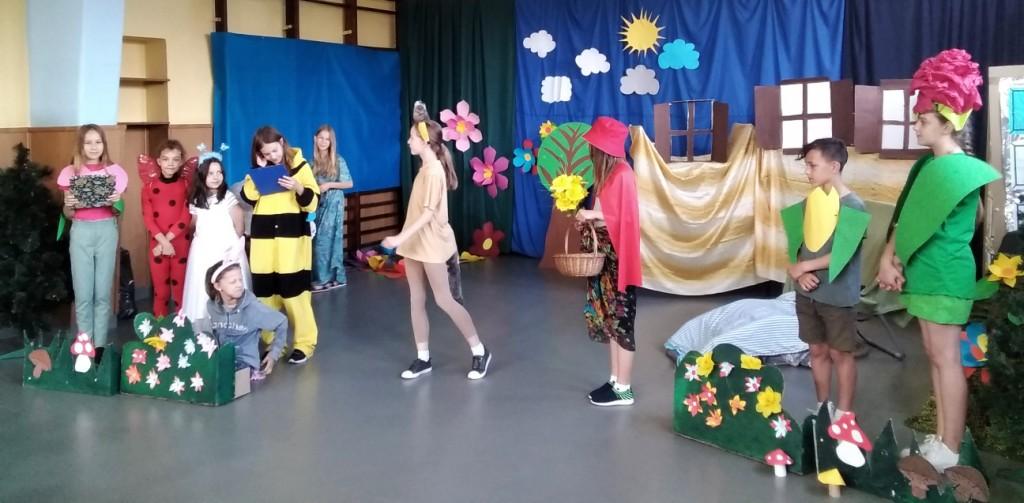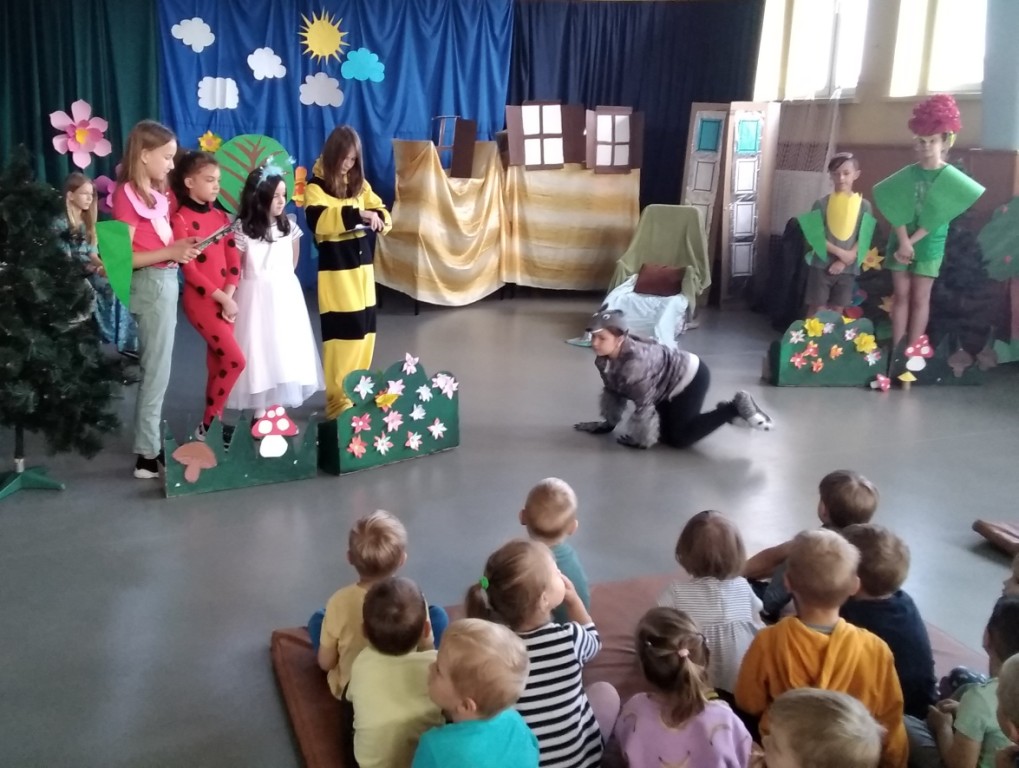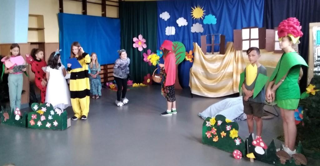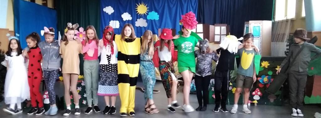 Poranny występ, przygotowany dla przedszkolaków i młodszych kolegów ze szkoły z okazji Dnia Dziecka, uświetniony został bajkowymi kostiumami oraz barwnymi dekoracjami przygotowanymi przez młodych aktorów. Gromkim brawom nie było końca.