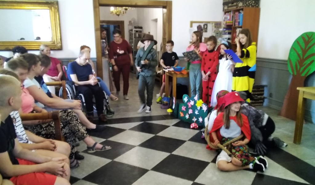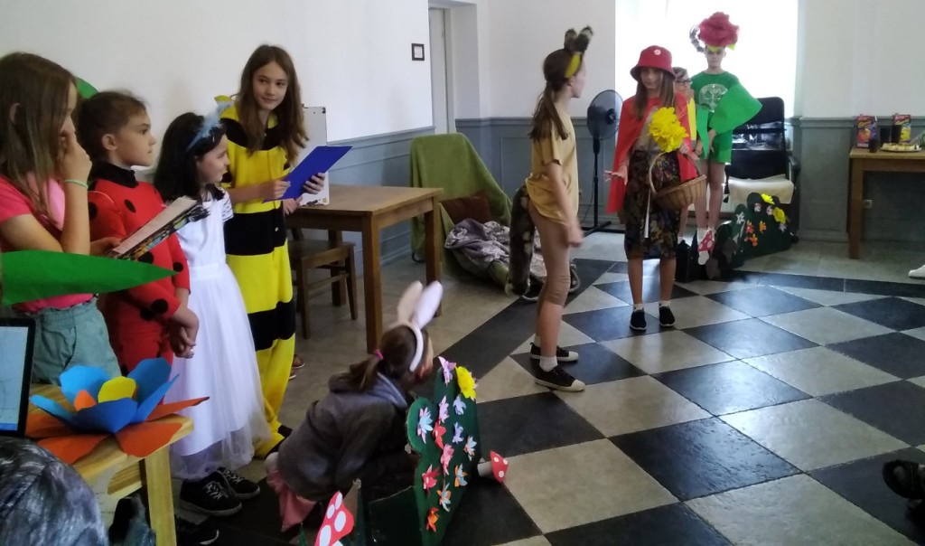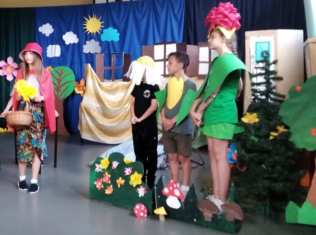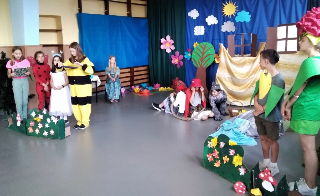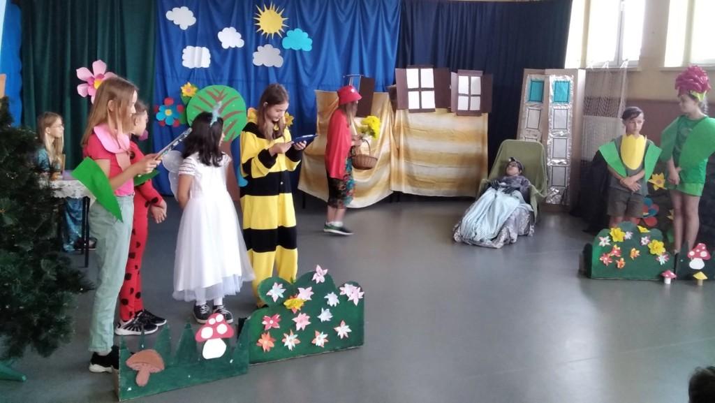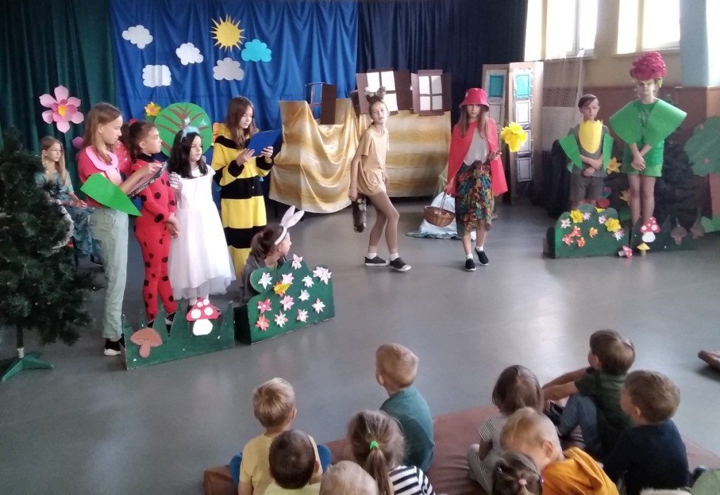 Poranny występ, przygotowany dla przedszkolaków i młodszych kolegów ze szkoły z okazji Dnia Dziecka, uświetniony został bajkowymi kostiumami oraz barwnymi dekoracjami przygotowanymi przez młodych aktorów. Gromkim brawom nie było końca.