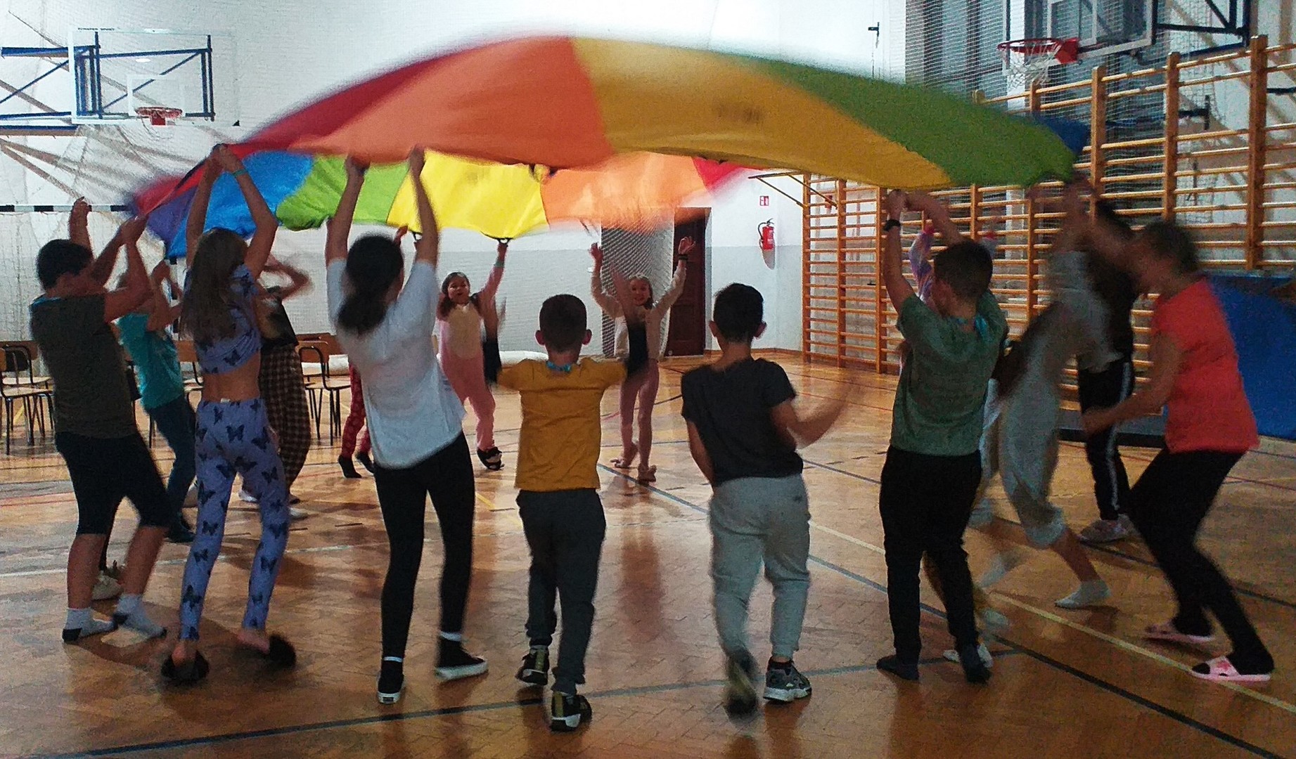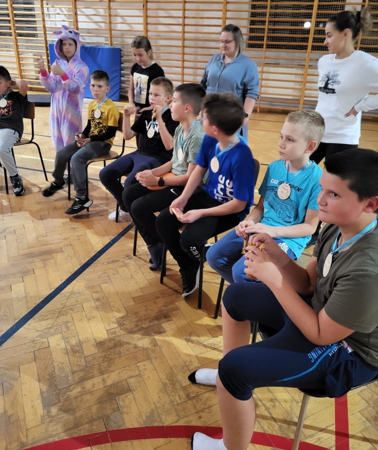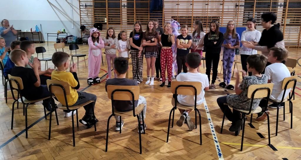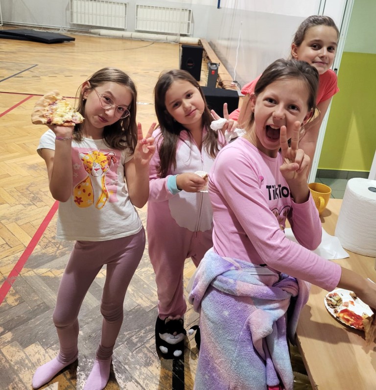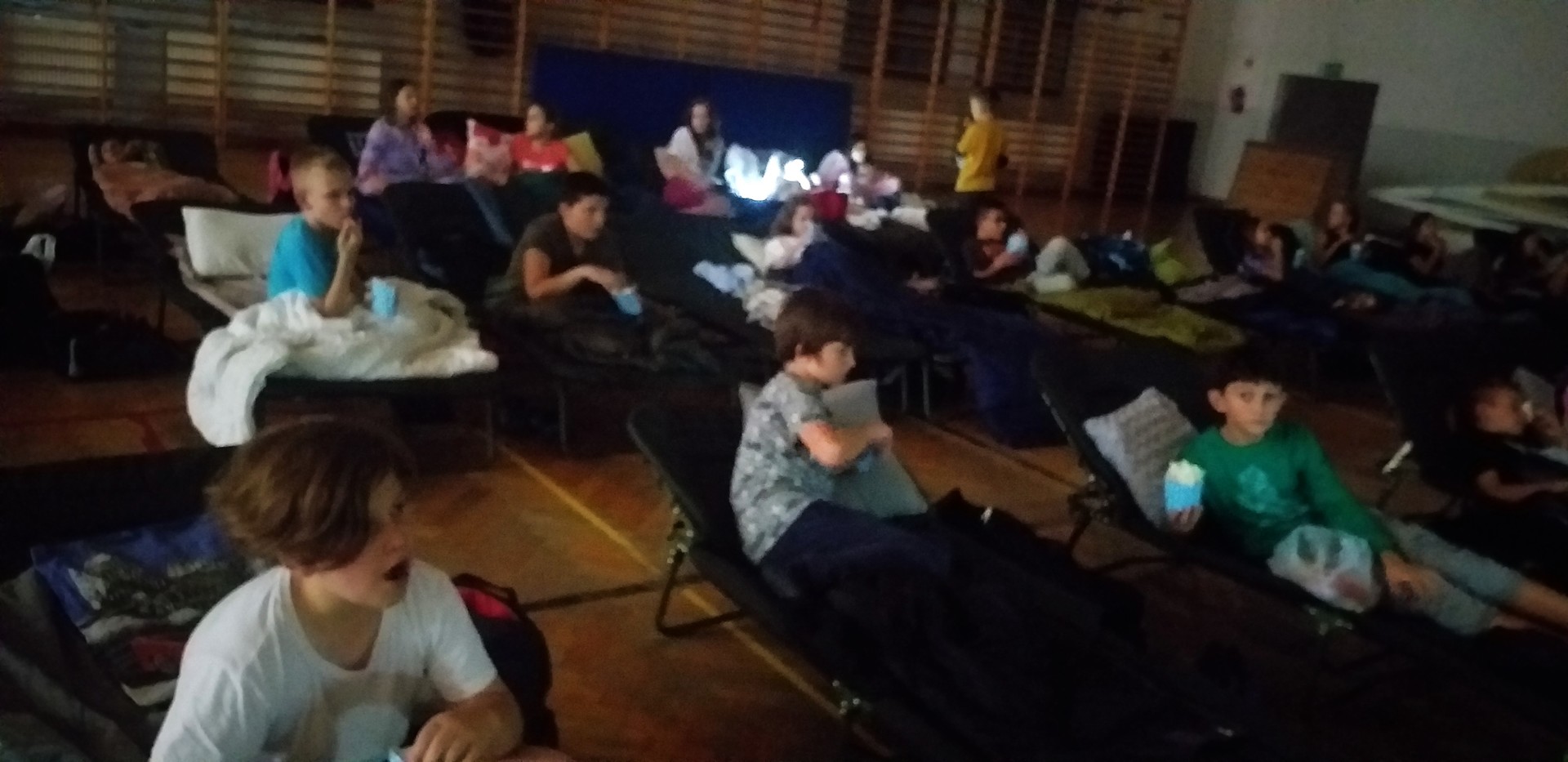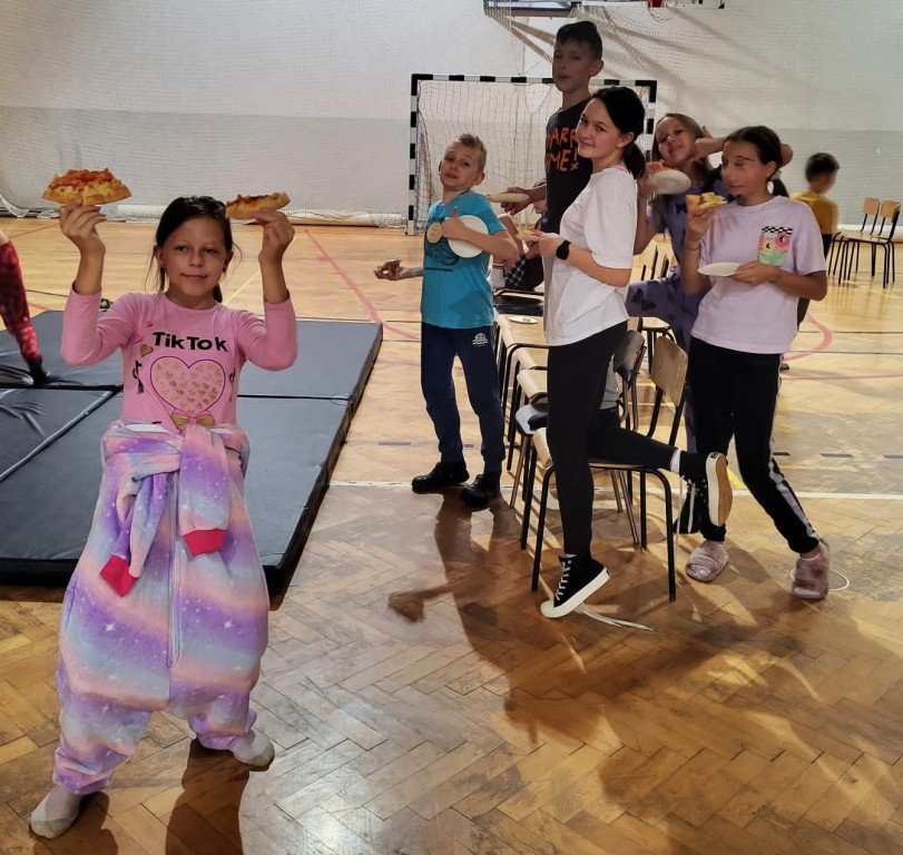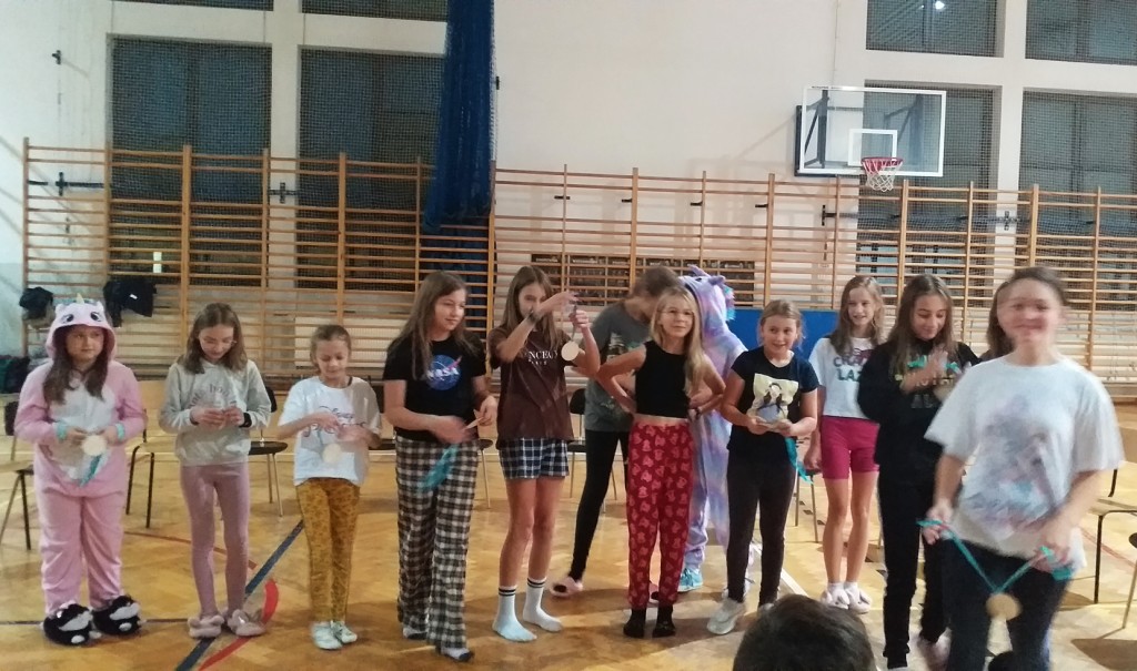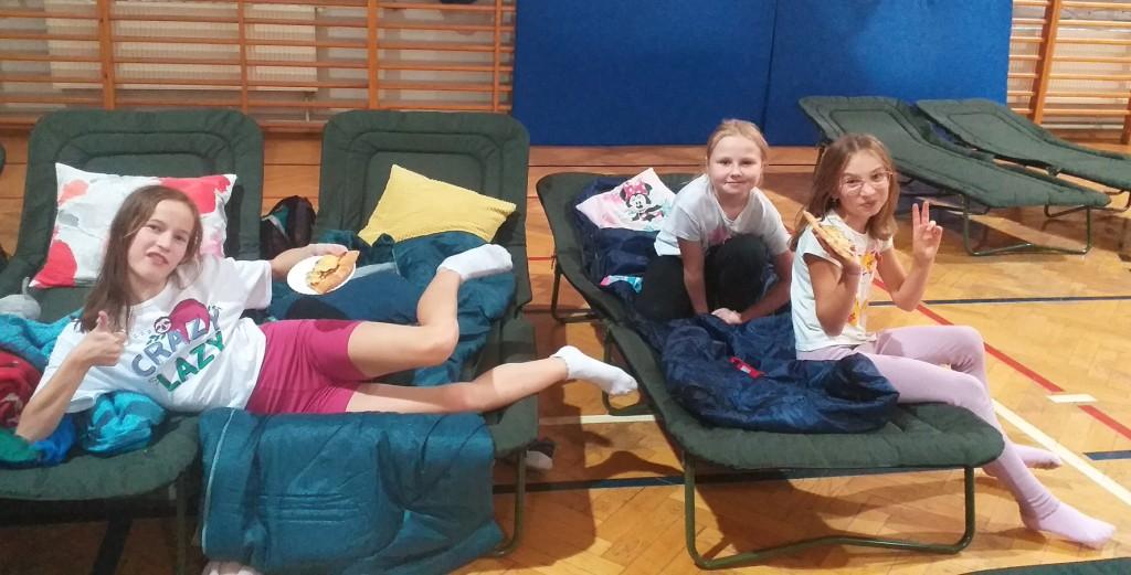 Nad wszystkim czuwała wychowawczyni, p. Anna Palarska, aktywnie wspierana przez panią Kingę Fidelus, Kingę Łukasik oraz panią Ewę Mikołajczyk. Tego wieczoru świętowaliśmy Dzień Chłopaka – nie zabrakło szczerych życzeń od dziewcząt oraz słodkich niespodzianek dla naszych super chłopaków, z których każdy uhonorowany został spersonalizowanym medalem. Wieczór i noc obfitowały w wiele atrakcji: gry i zabawy ruchowe, integrujące zabawy z chustą animacyjną, był czas na rozgrywki planszowe i karciane, emocjonujące harce z latarkami oraz oczywiście wieczór, a w zasadzie dłuuuga noc filmowa do „ostatniego widza”. Jak przystało na imprezowy wieczór, nie obyło się też bez wyśmienitej pizzy i popcornu dla każdego.