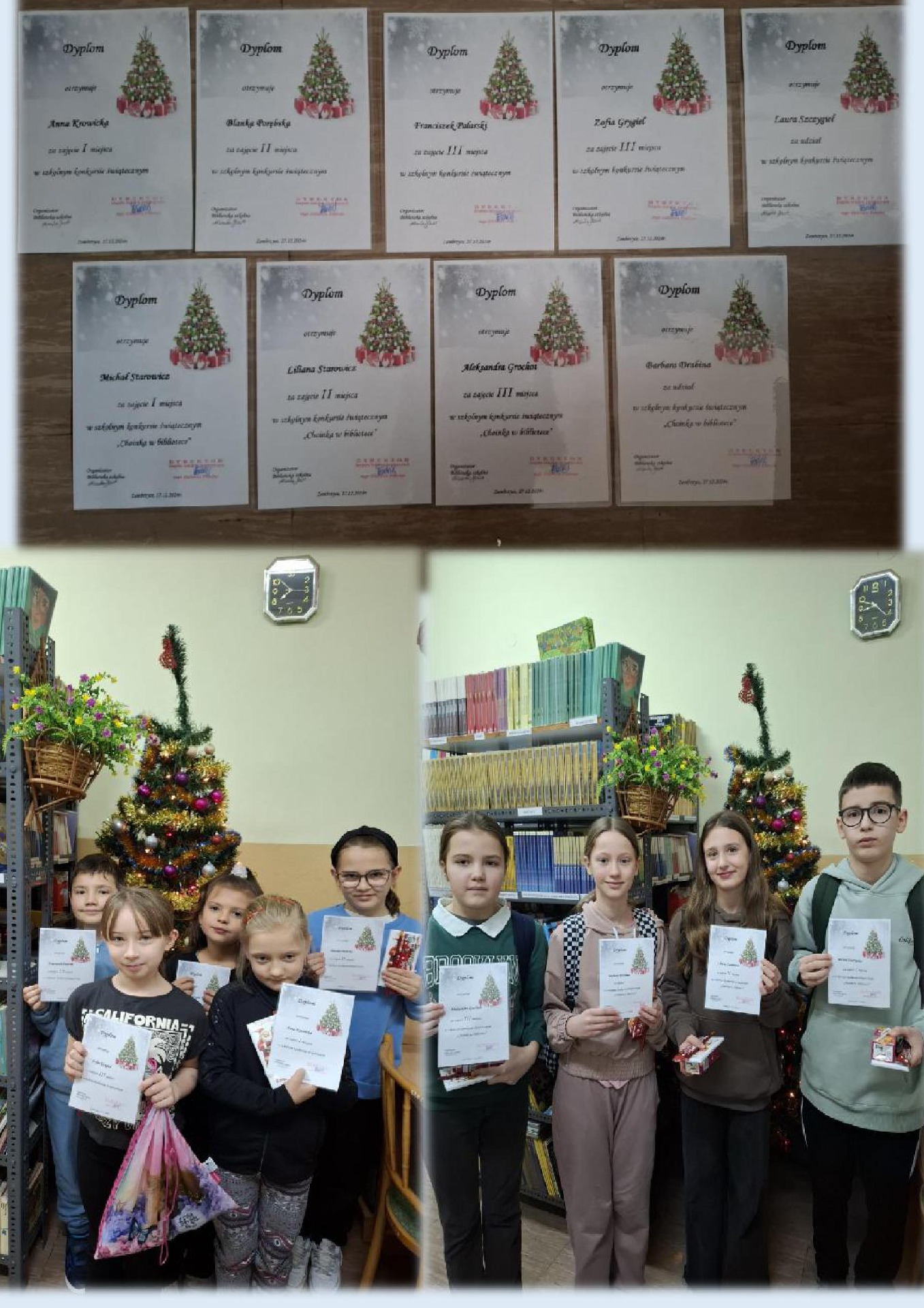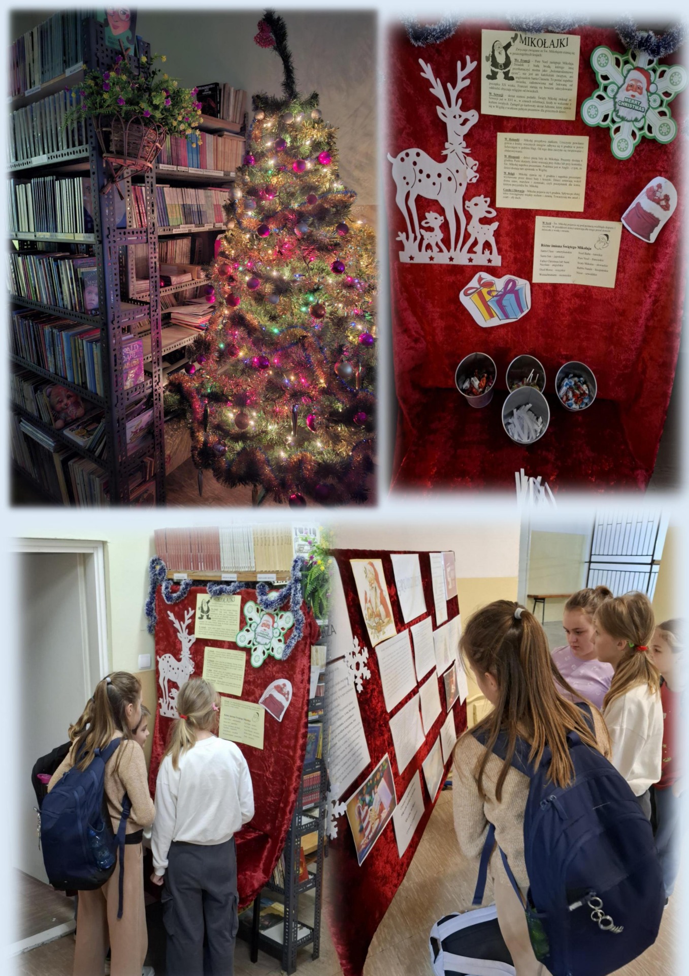 Biblioteka zaproponowała uczniom świąteczne akcje czytelnicze mające na celu zachęcenie do odwiedzenia biblioteki i wypożyczenia książek. Wyjątkowy nastrój tworzyły przygotowane gazetki oraz wystrój pomieszczenia.