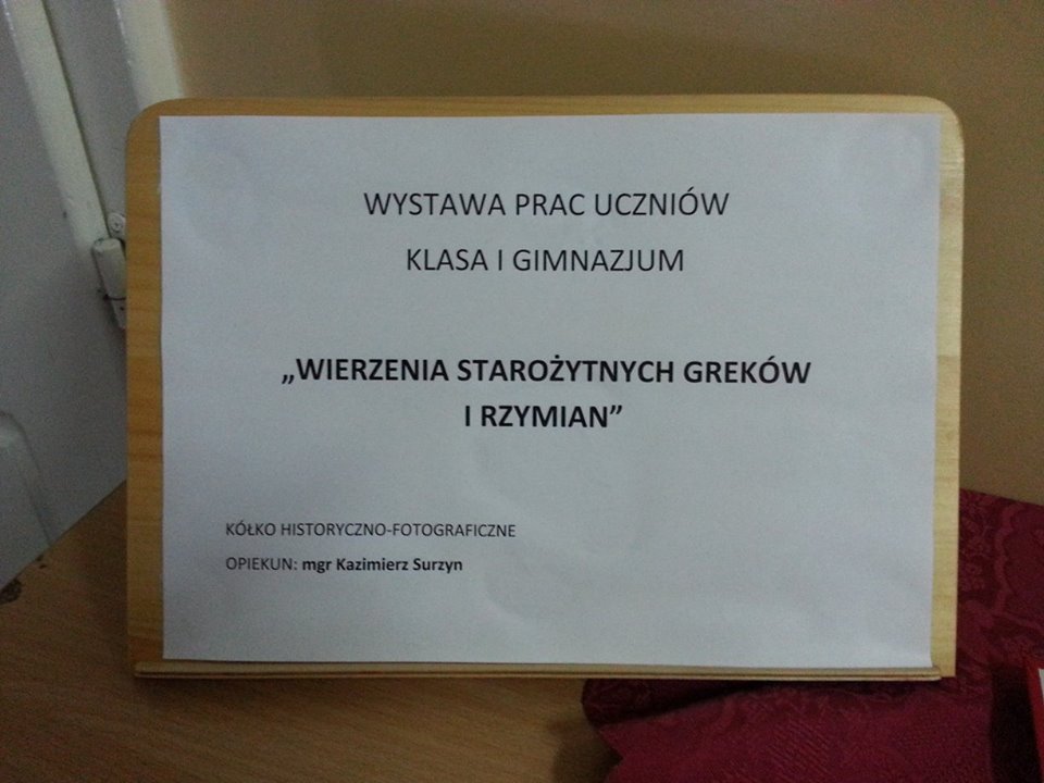 W Zespole Szkół Gimnazjum w Zembrzycach w dniu 26 Listopada 2013 roku została zorganizowana przez mgr Kazimierza Surzyna, opiekuna koła historyczno-fotograficznego, wystawa pokonkursowa prac uczniów z klasy I, pt. "Wierzenia Starożytnych Greków i Rrzymian".